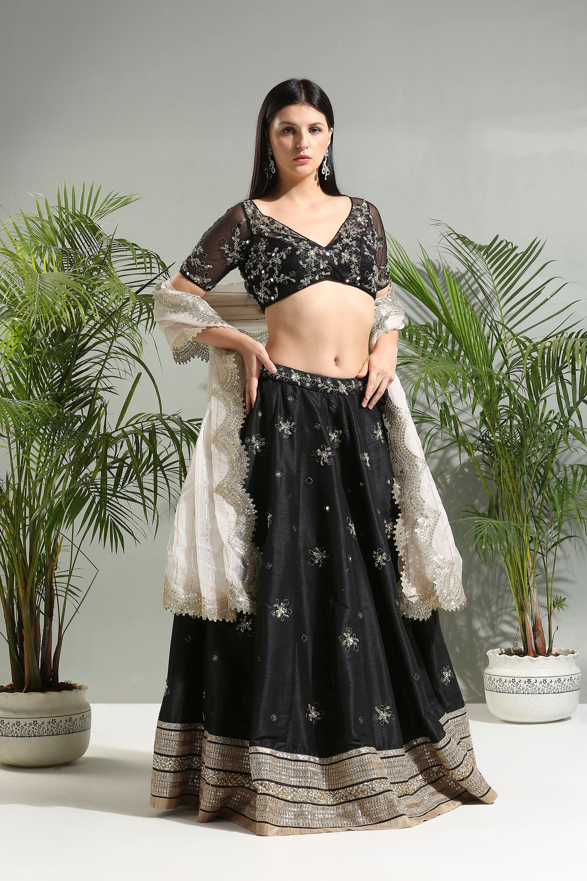 Black raw silk lehenga with mirror, beads and sequin embroidery paired with Black tulle blouse in Mirror and beads placement hand work and Ivory organza dupatta