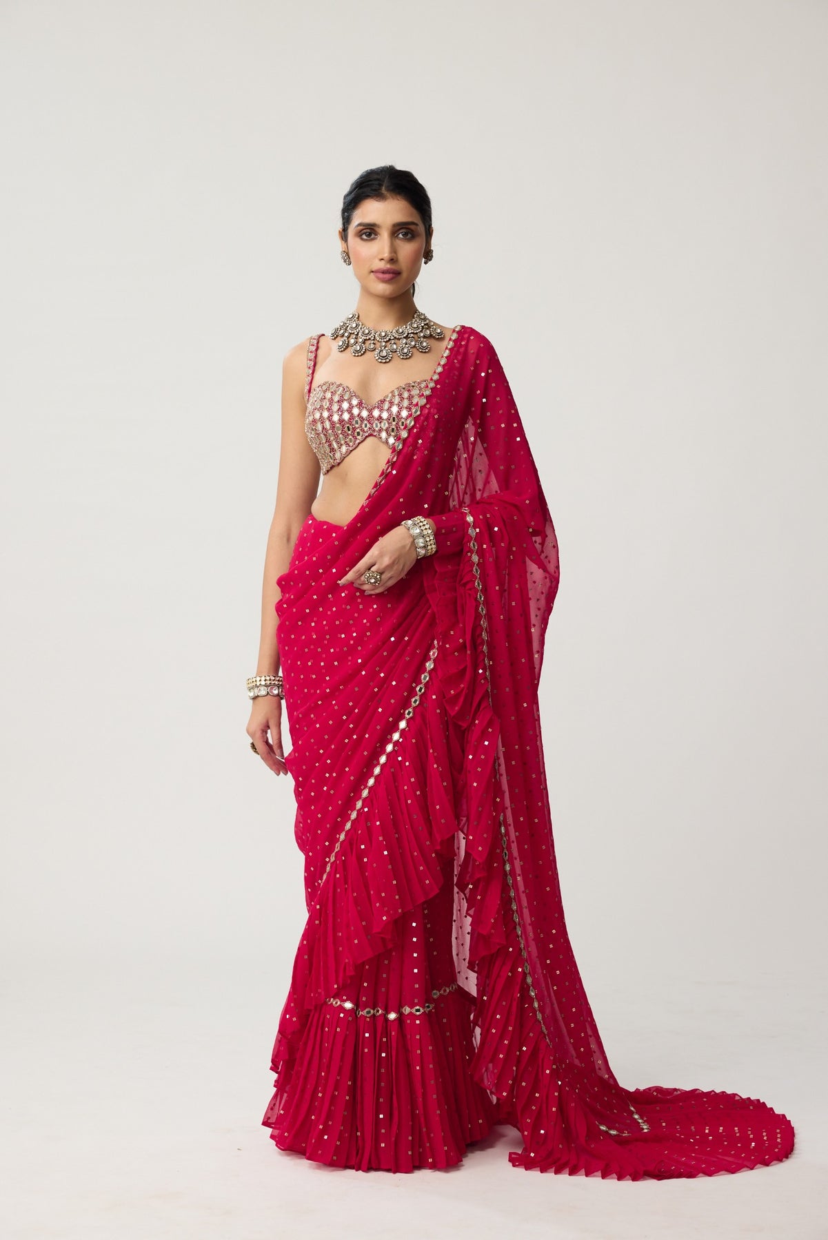 Crimson Red Mirror embroidered Georgette Saree clubbed with real hand cut mirror embroidered sleeveless blouse.