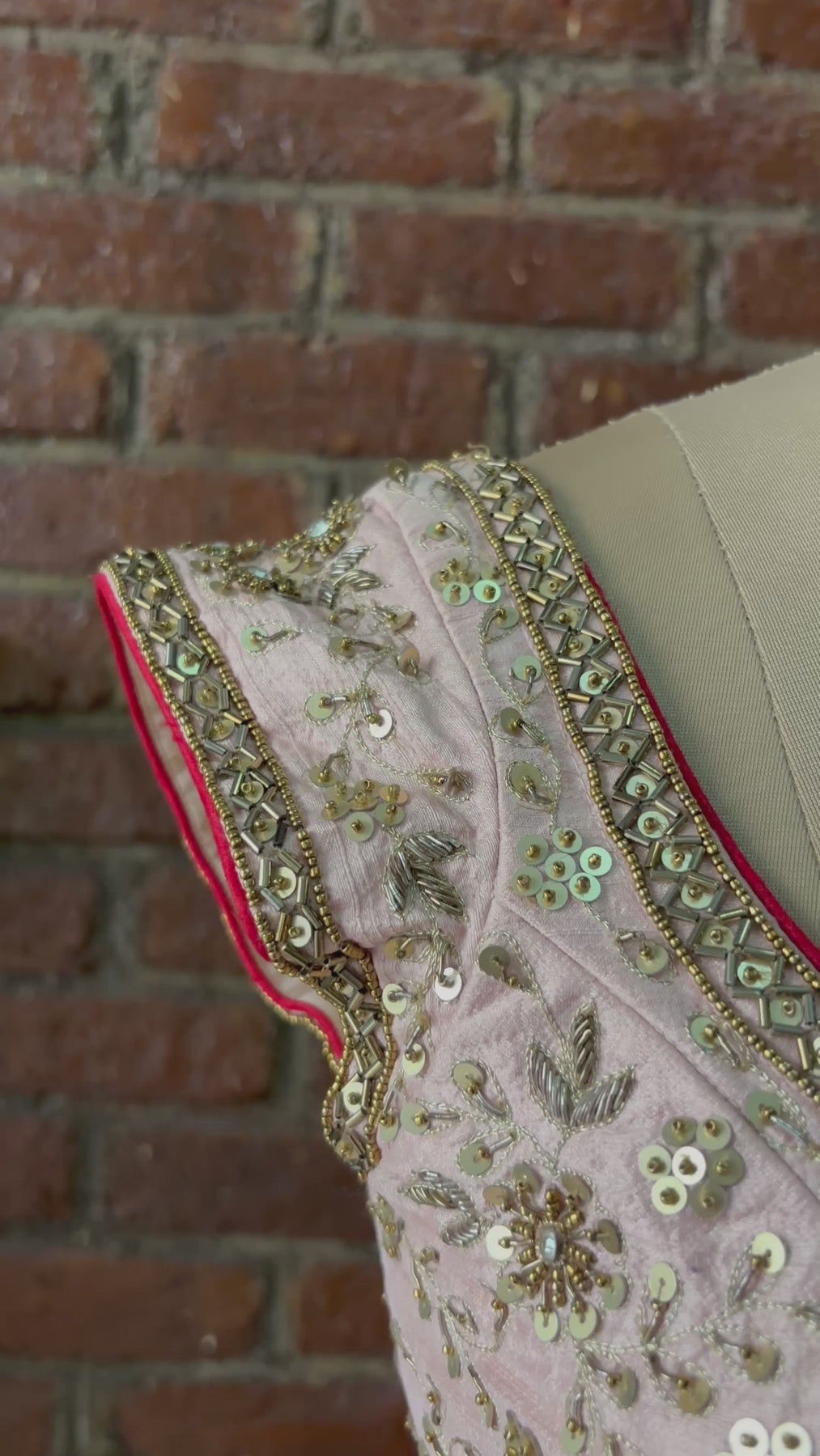 Multipanel lehenga set in Gota, Thread and butti design in multi-hued pastel shade paired with Powder Pink raw silk blouse in Zardozi and sequin work and Lime Yellow organza dupatta