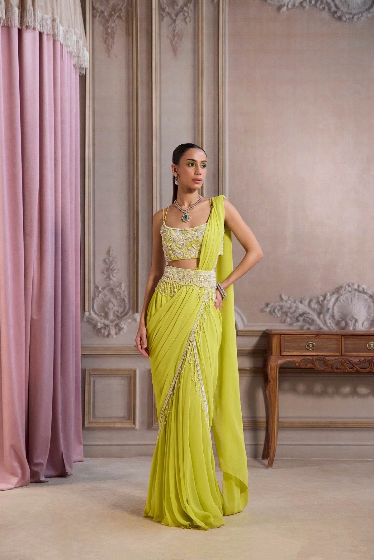 Neon green pre-drape saree with waist belt featuring statement glass bead tassels on belt, scalloped tassels and on palla, the floral embroidered blouse is embroidered with pearls, cutdana , glass beads and stone and small detailing of beads on noodle straps.