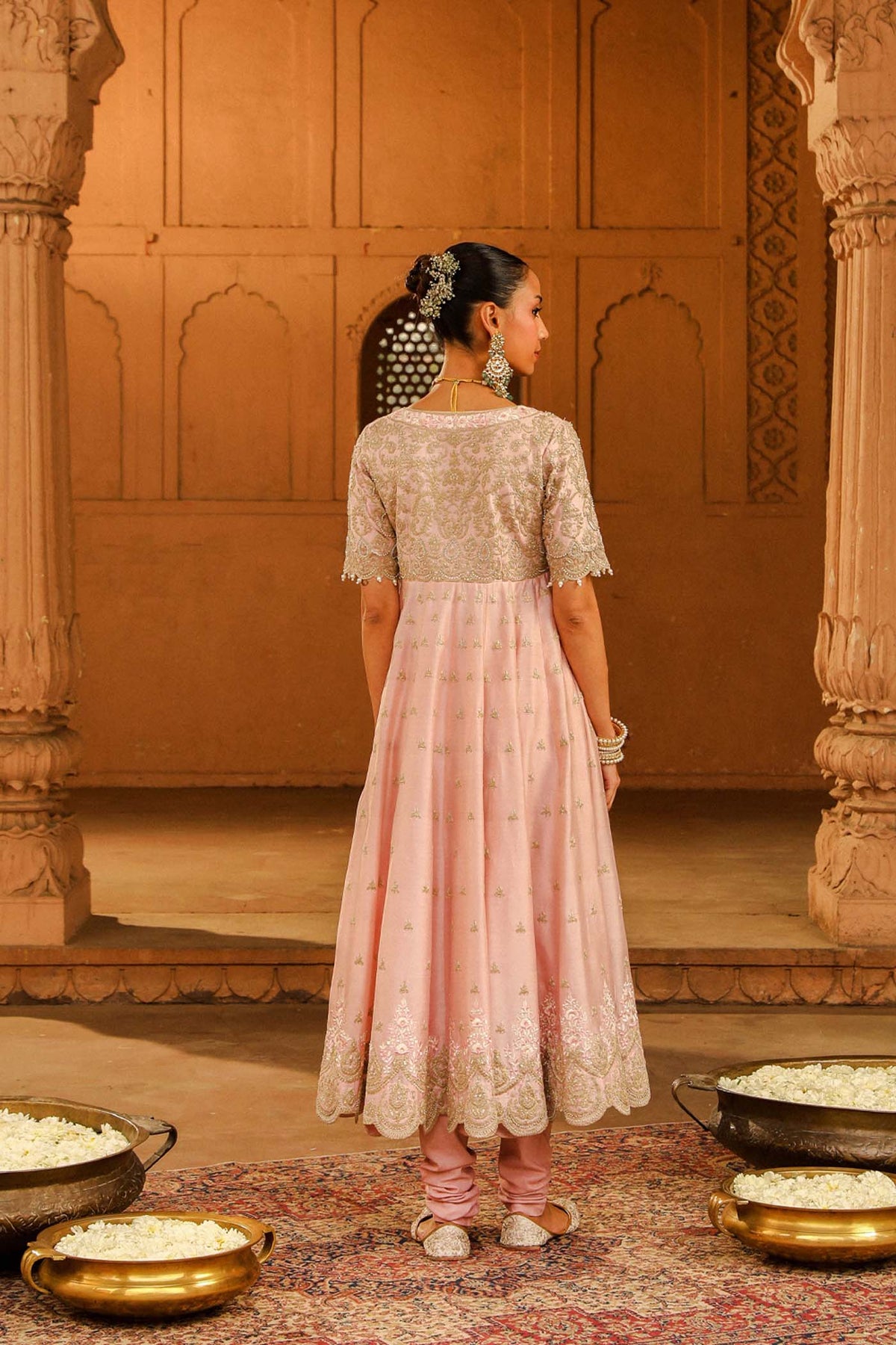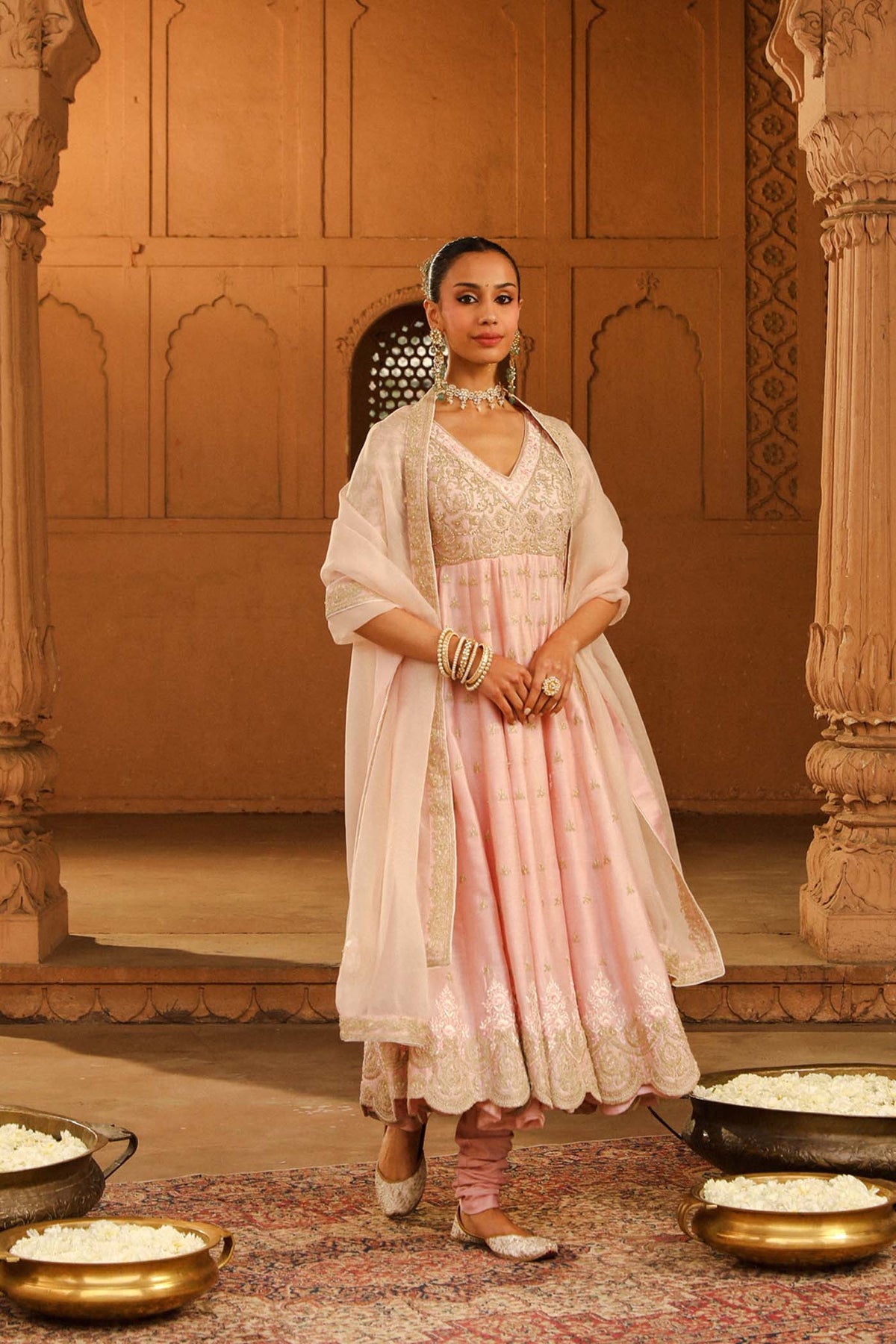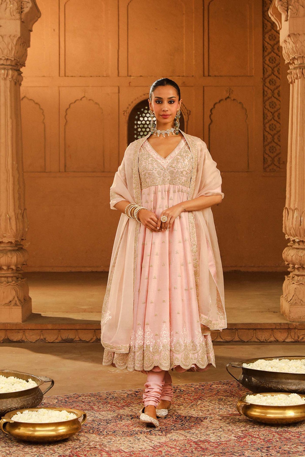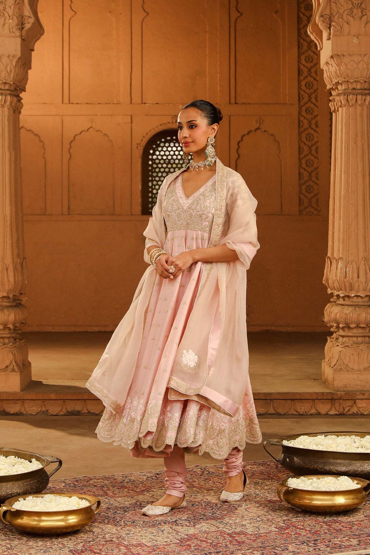 The long ankle length kalidaar anarkali is made in pure silk chanderi fabric teamed up with a chooridaar and a silk organza dupatta. The outfit is having a broad deep scoop neck and a deep back. The outfit is adorned with Kashmiri tilla and parsi gara embroidery highlighted with basra moti. The outfit is finished with scallop detailing.