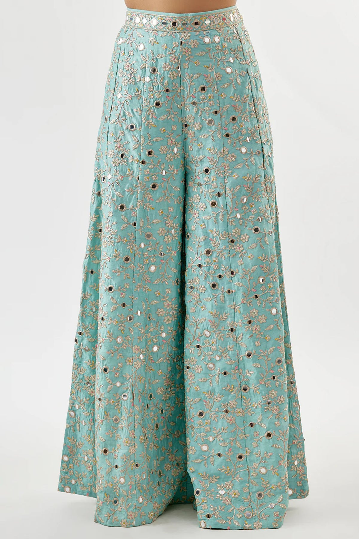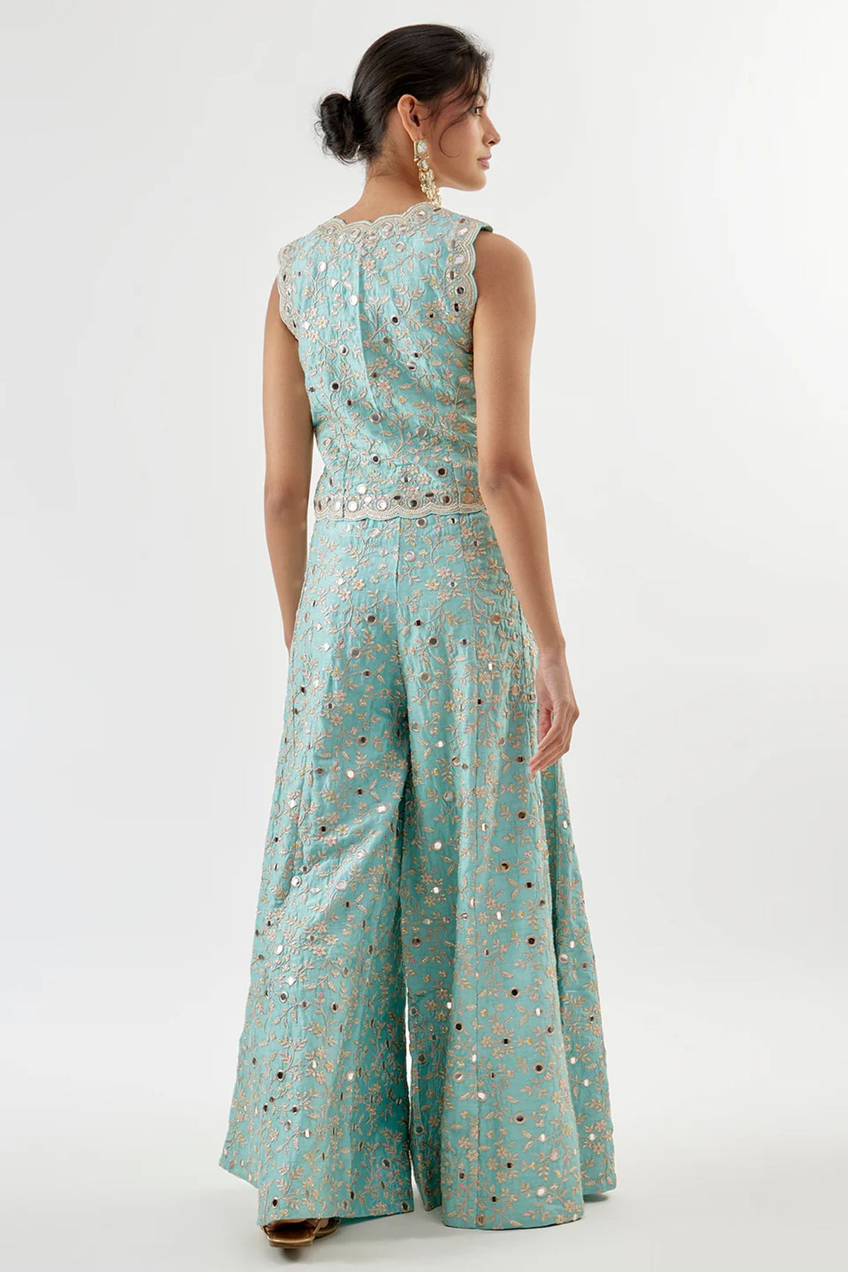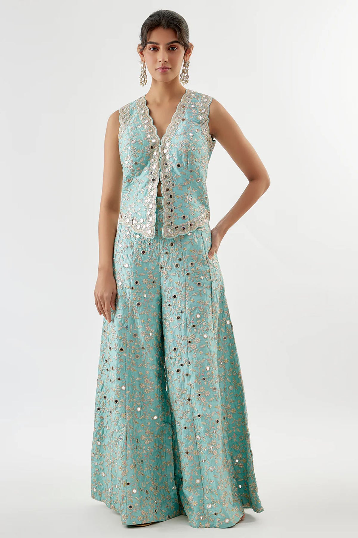 This mirror-embellished vest features a deep V-neckline and scalloped edges. Paired with flowing, wide-leg trousers with delicate embroidery and mirror accents, creating a cohesive and refined ensemble.
