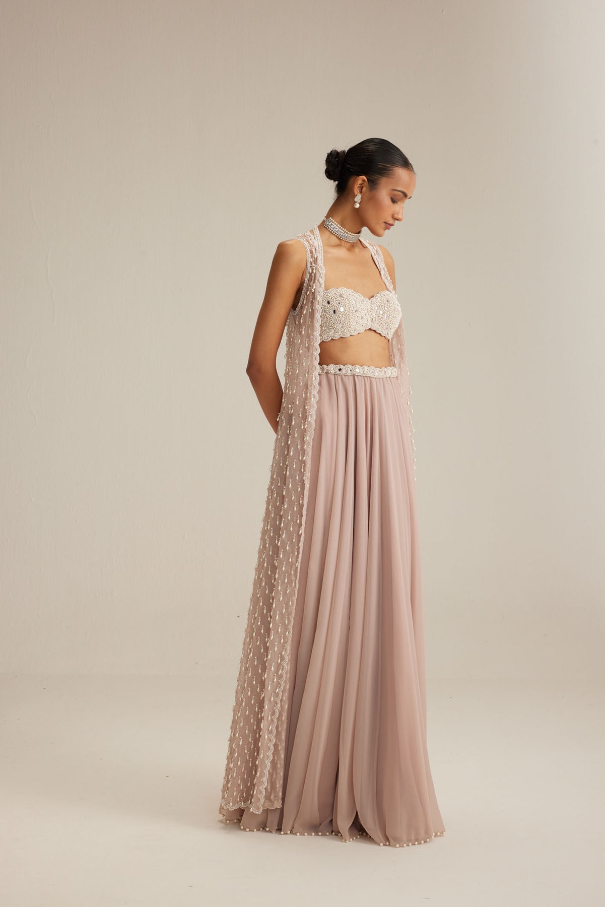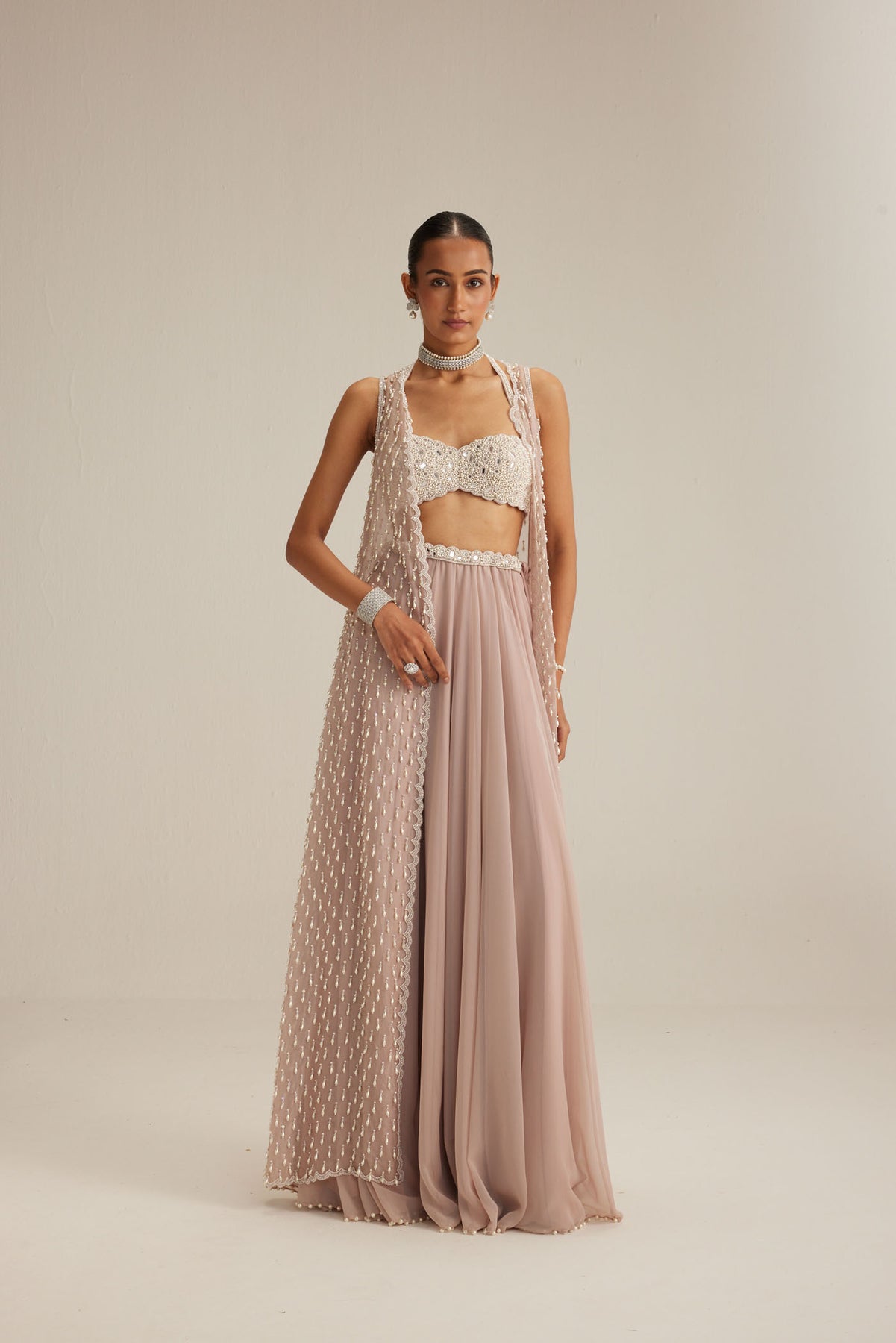 Ash Pink Jacket adorned with mirror and pearl embroidery and cascading pearl tassels, paired with a heavily embroidered blouse and skirt.