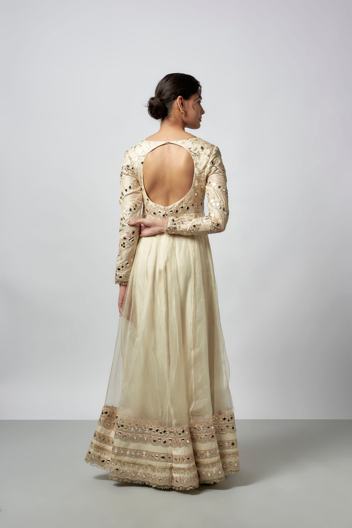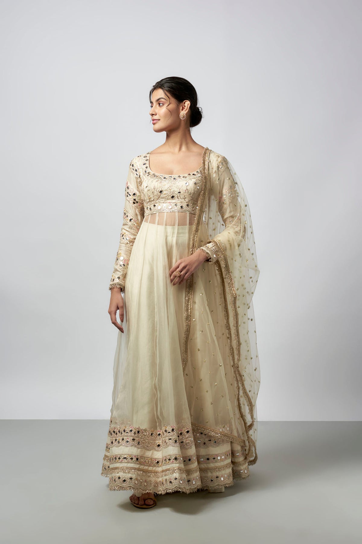 This elegant anarkali features intricate embroidery with mirror detailing and delicate patterns. The long sleeves mirror the embroidery on the bodice. A matching net dupatta with subtle sequins drapes gracefully over the shoulder.