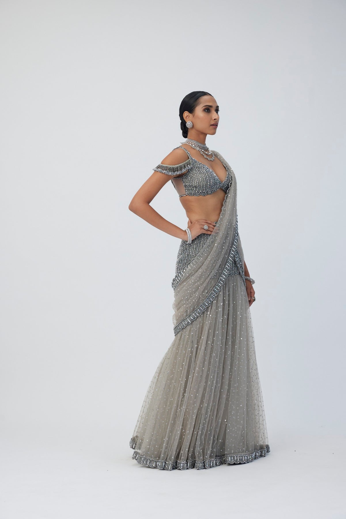 Intricately Hand Embroidered Pre Draped Georgette Saree featuring sequins and crystal embroidery clubbed With cap sleeved jewelled blouse with crystal embellishments.