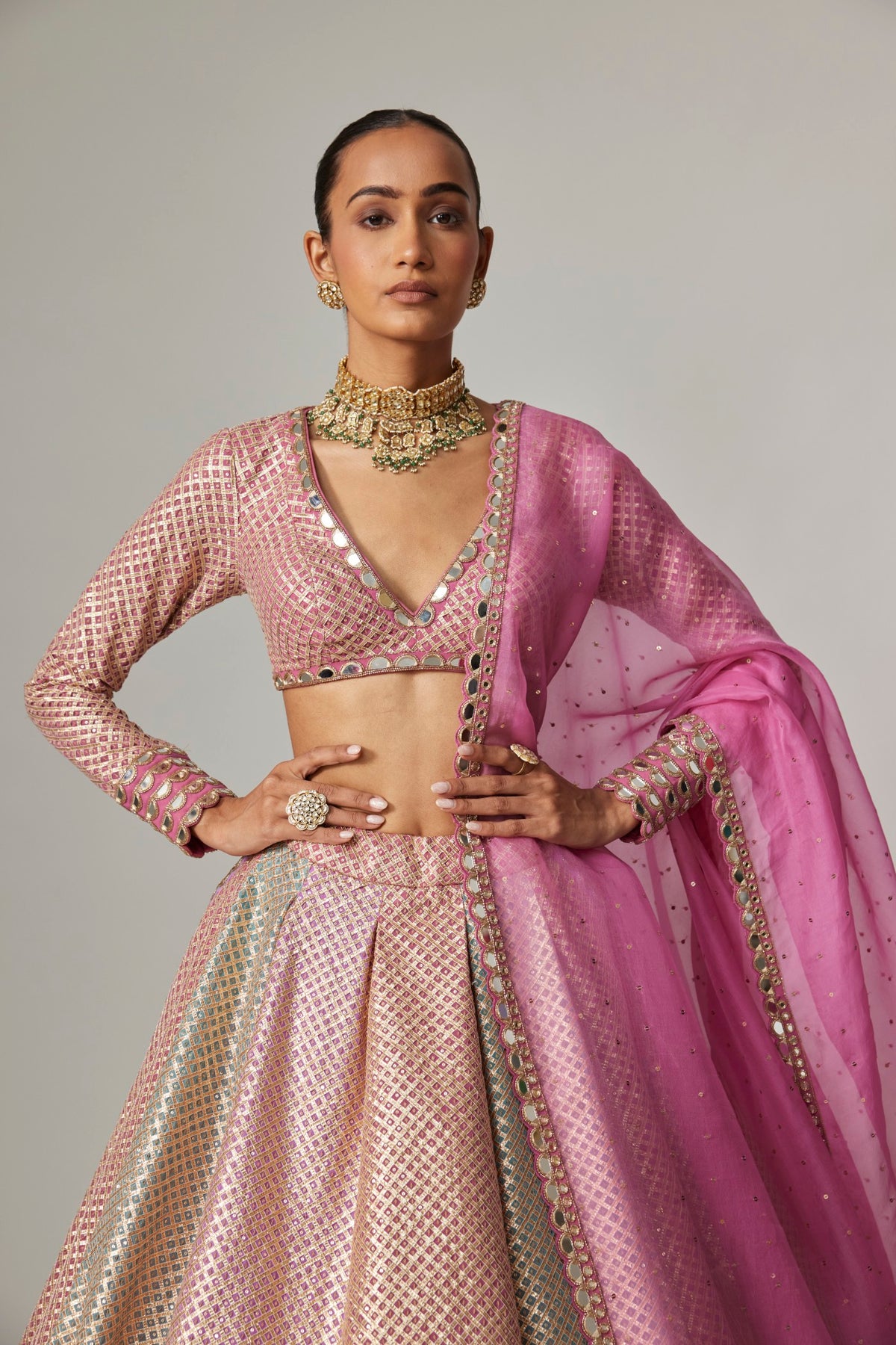 A vibrant multicolor Lehenga in mauve,aqua and dark blush tones, adorned with golden gota embroidery, paired with a v neck crop top and dark blush dupatta.