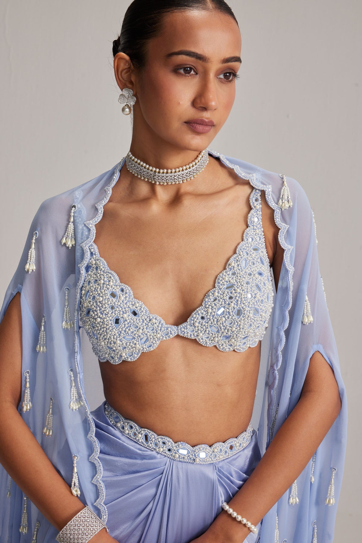 Dew Blue Satin draped skirt paired with a heavily embroidered Pearl and Mirror blouse and Cape with Cascading Tassels.