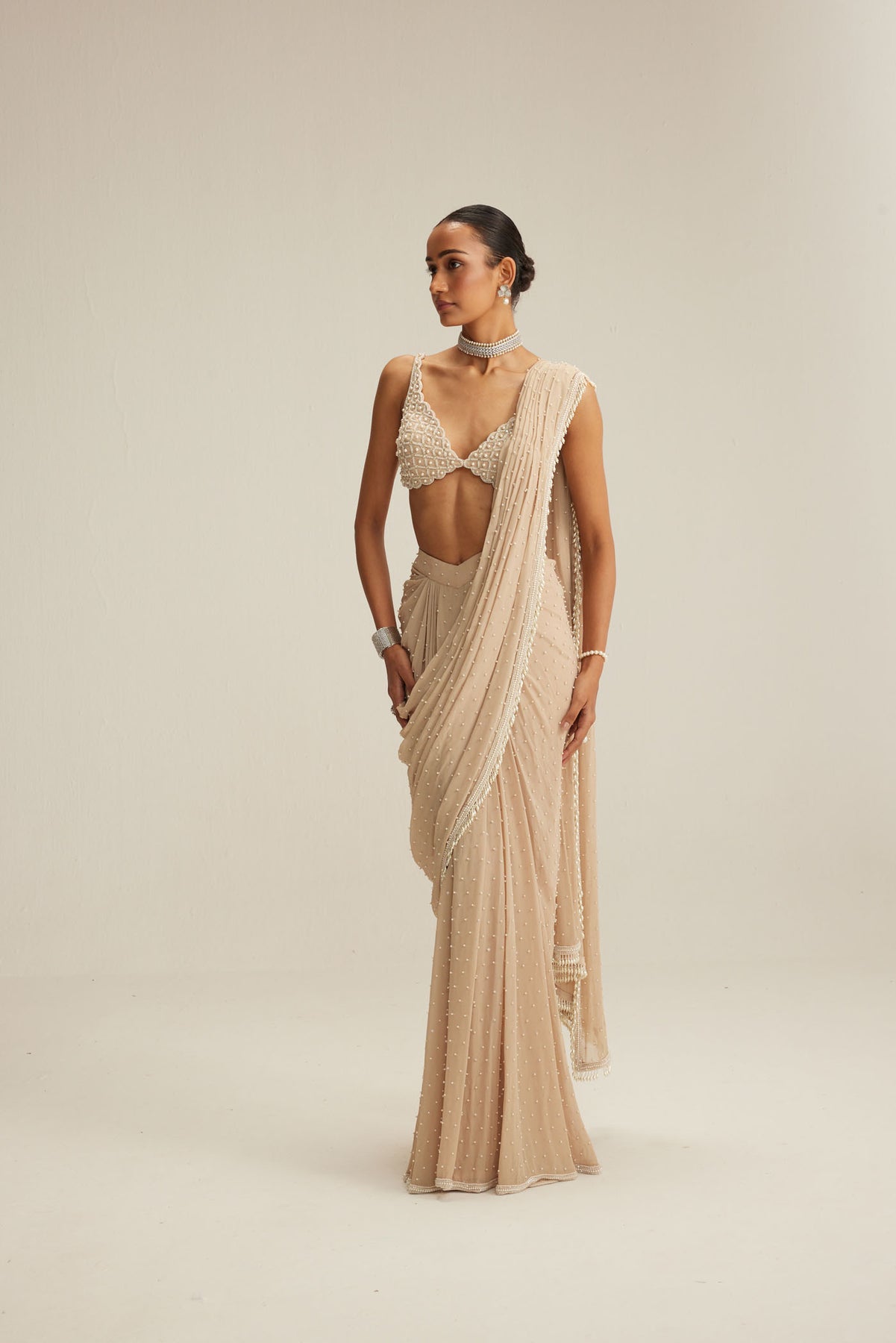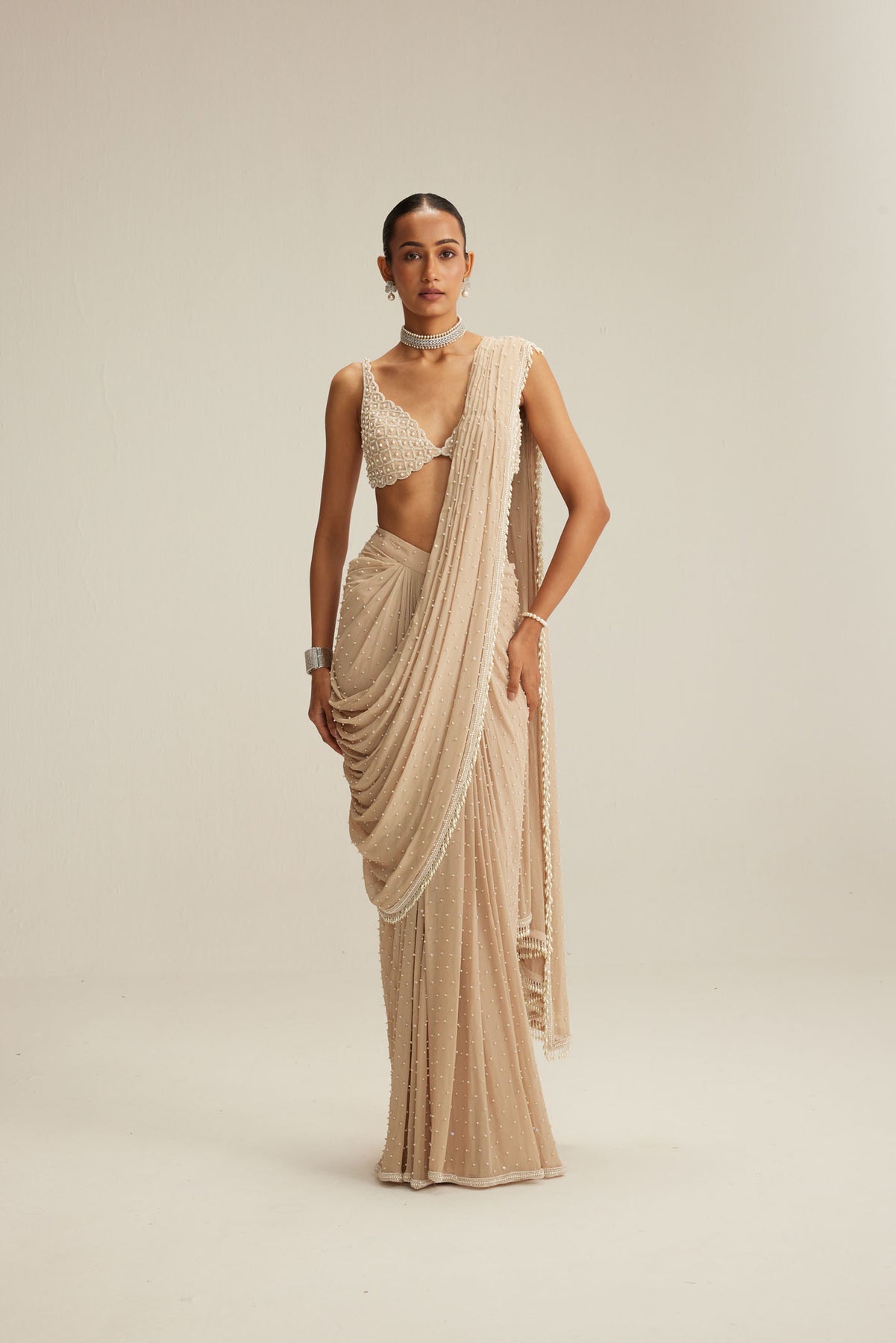 Light beige draped saree set, adorned with mirror and pearl embroidery and cascading pearl tassels, paired with a heavily embroidered V neck blouse.