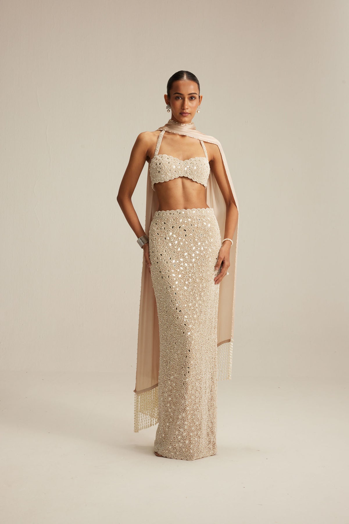Light beige Pencil Skirt paired with a heavily embroidered blouse and Satin Stole With Cascading Pearl tassels.