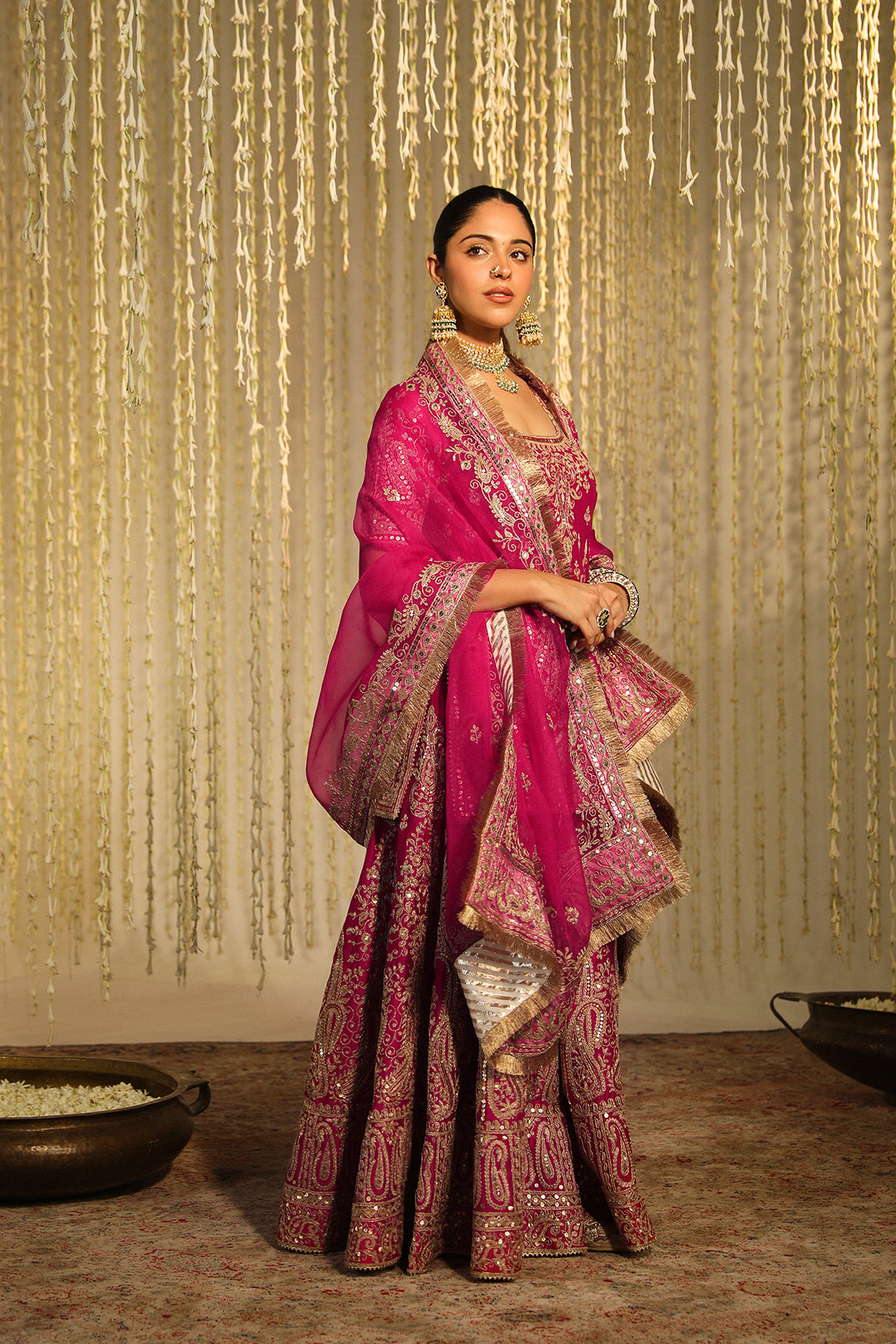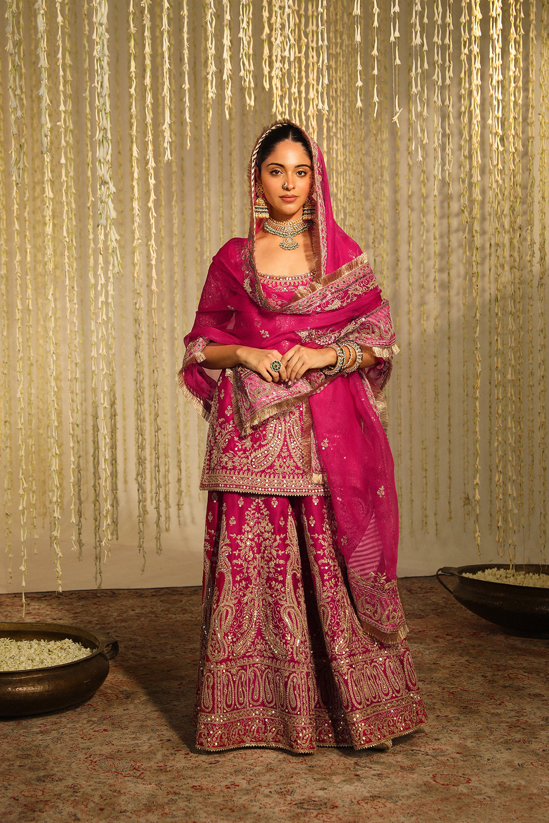 The short straight Mazneen kurta set is made in pure silk chanderi and teamed up with a silk organza dupatta. The kurta is having a round broad deep scoop neck at front, a deep back and elbow sleeves. The outfit is adorned with exquisite kirandori with sitaara. The outfit is finished with a contrast banarsi and kinari