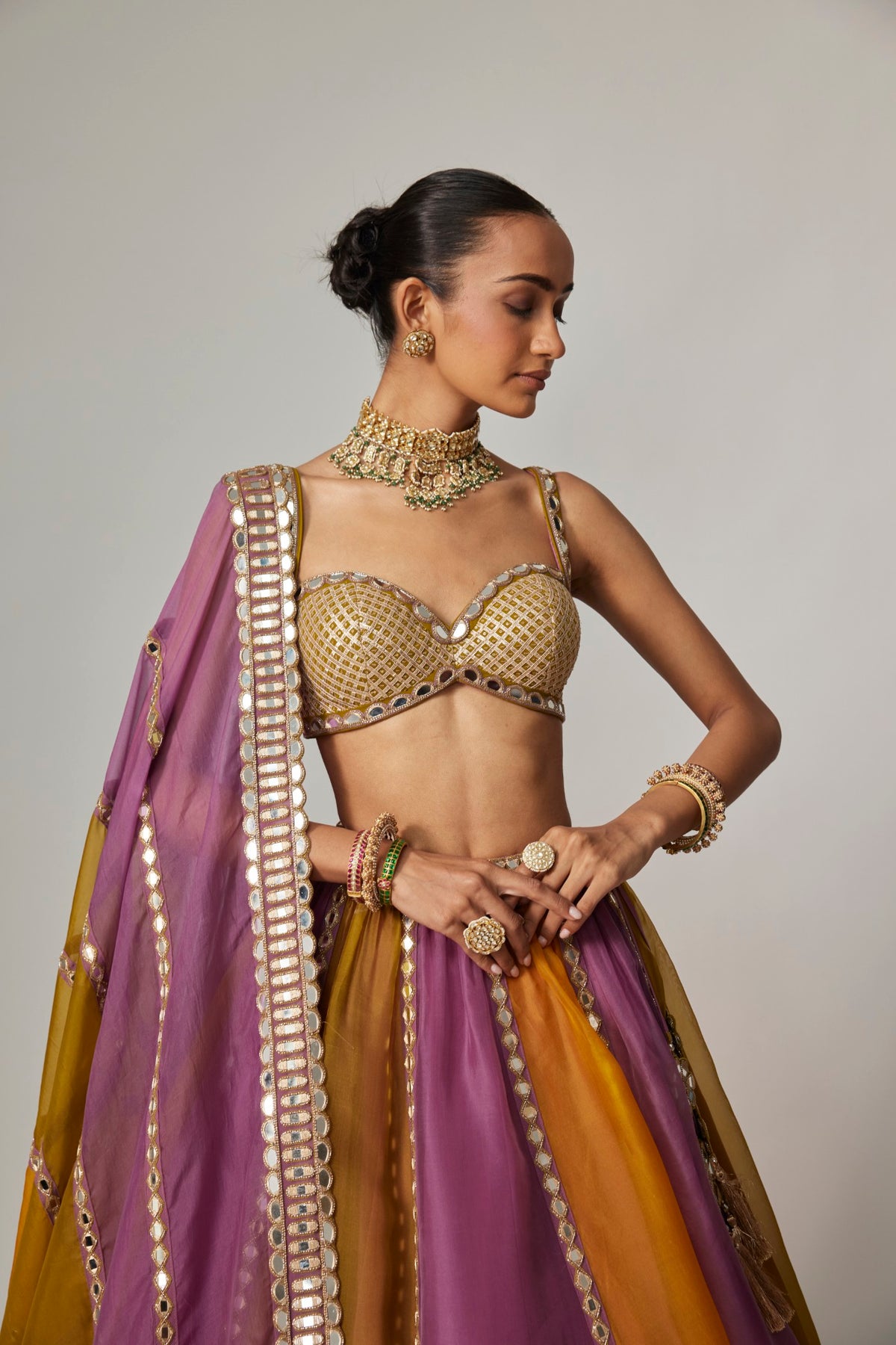 A vibrant multicolor Lehenga in mustard, mauve, and green tones, adorned with golden gota embroidery, paired with a sweetheart blouse and dupatta.