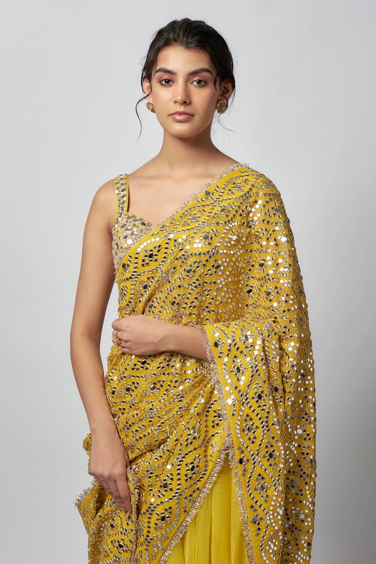 This saree featuring blend of organza and chiffon intricately adorned with dazzling mirror work and detailed embroidery, forming an intricate geometric pattern catches the light beautifully. The blouse, hand crafted with matching embellishments and a scoop neckline, adding a contemporary touch.