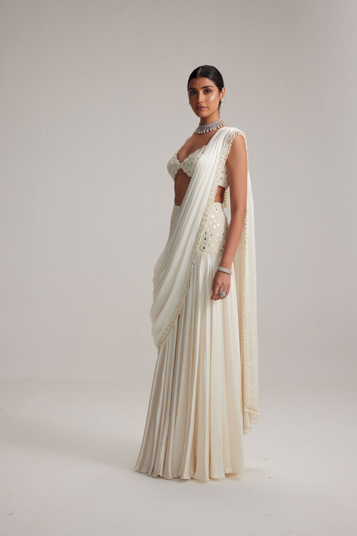 White satin draped saree set, adorned with mirror and pearl embroidery paired with a heavily embroidered blouse.