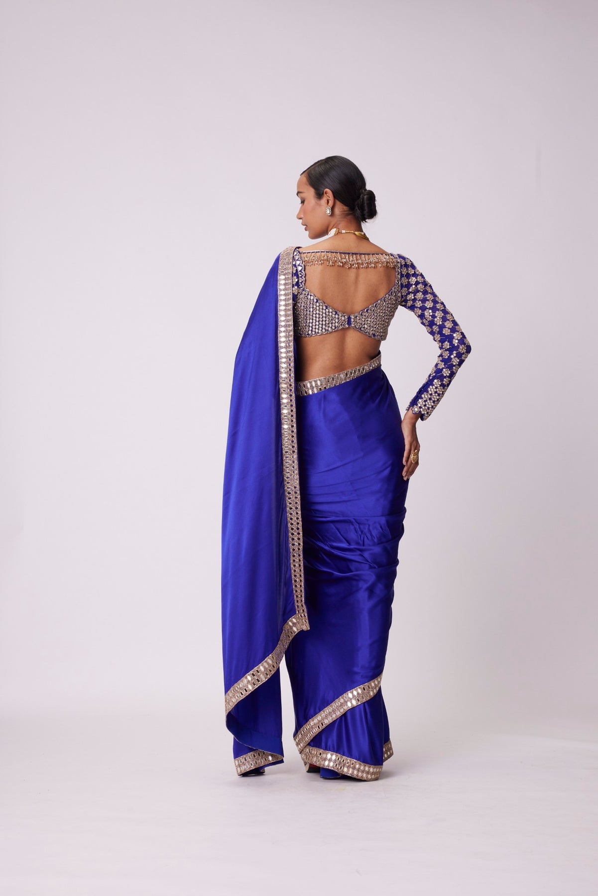 Persian blue hand embroidered border satin saree clubbed with real hand cut mirror embroidered full sleeve blouse.