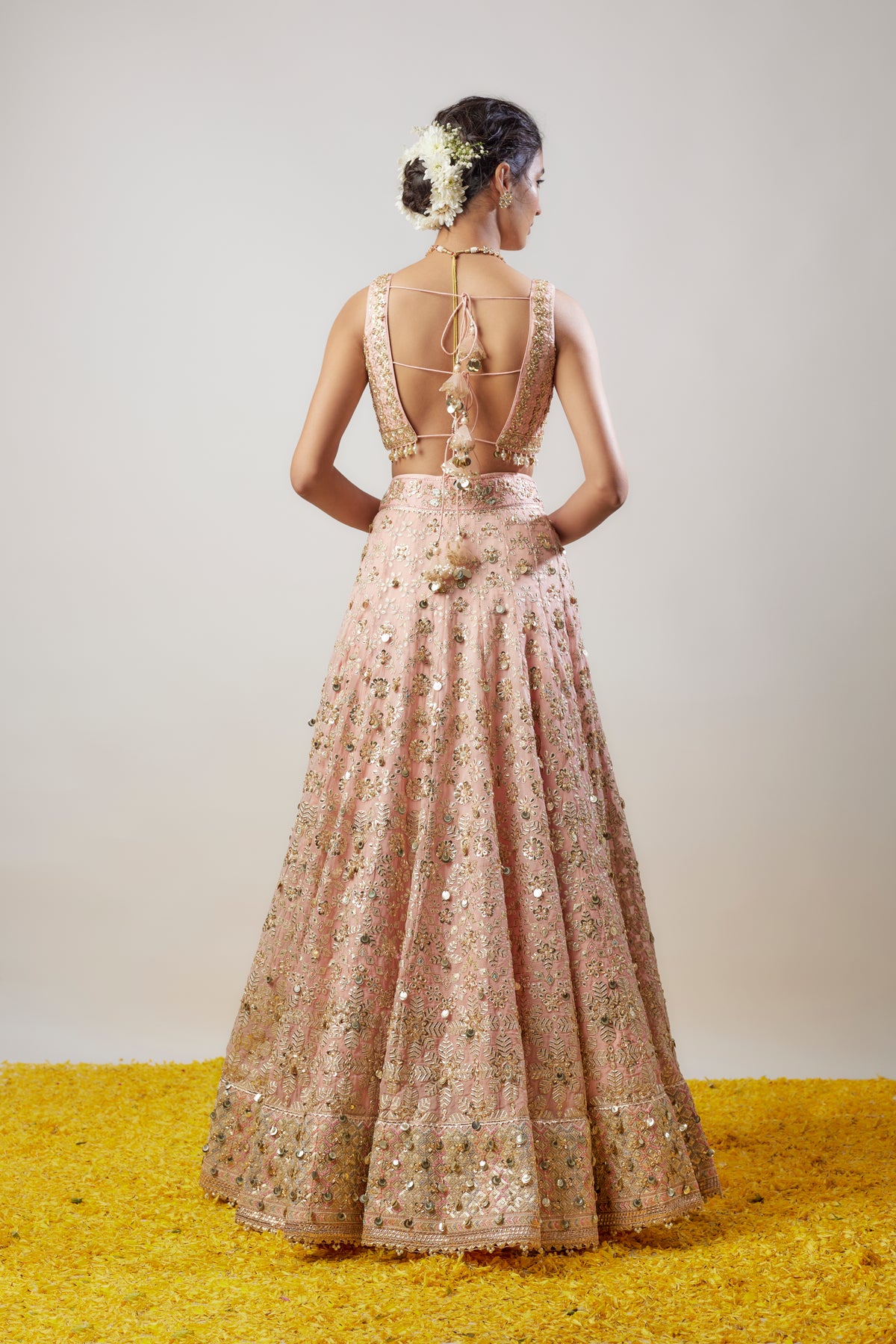 Embrace elegance with our stunning lehenga set, featuring a beautifully crafted sleeveless blouse that showcases intricate embellishments. The flowing lehenga, adorned with exquisite patterns, drapes gracefully, making it perfect for any festive occasion. Elevate your style and celebrate tradition with a contemporary twist!