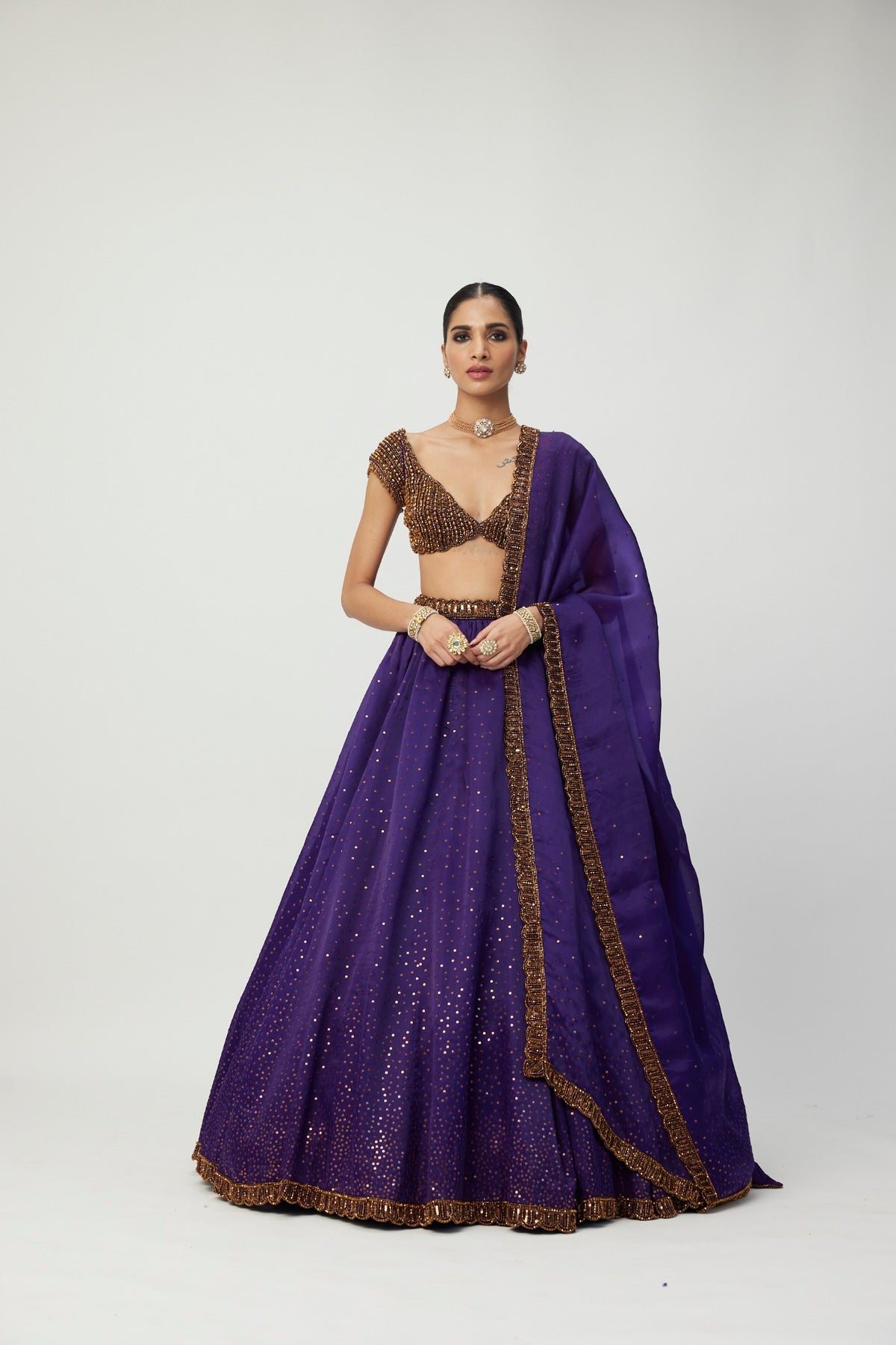 Intricately hand embroidered Lehenga And Dupatta featuring sequins, Cutdana and crystal embroidery clubbed With jewelled blouse with crystal embellishments.