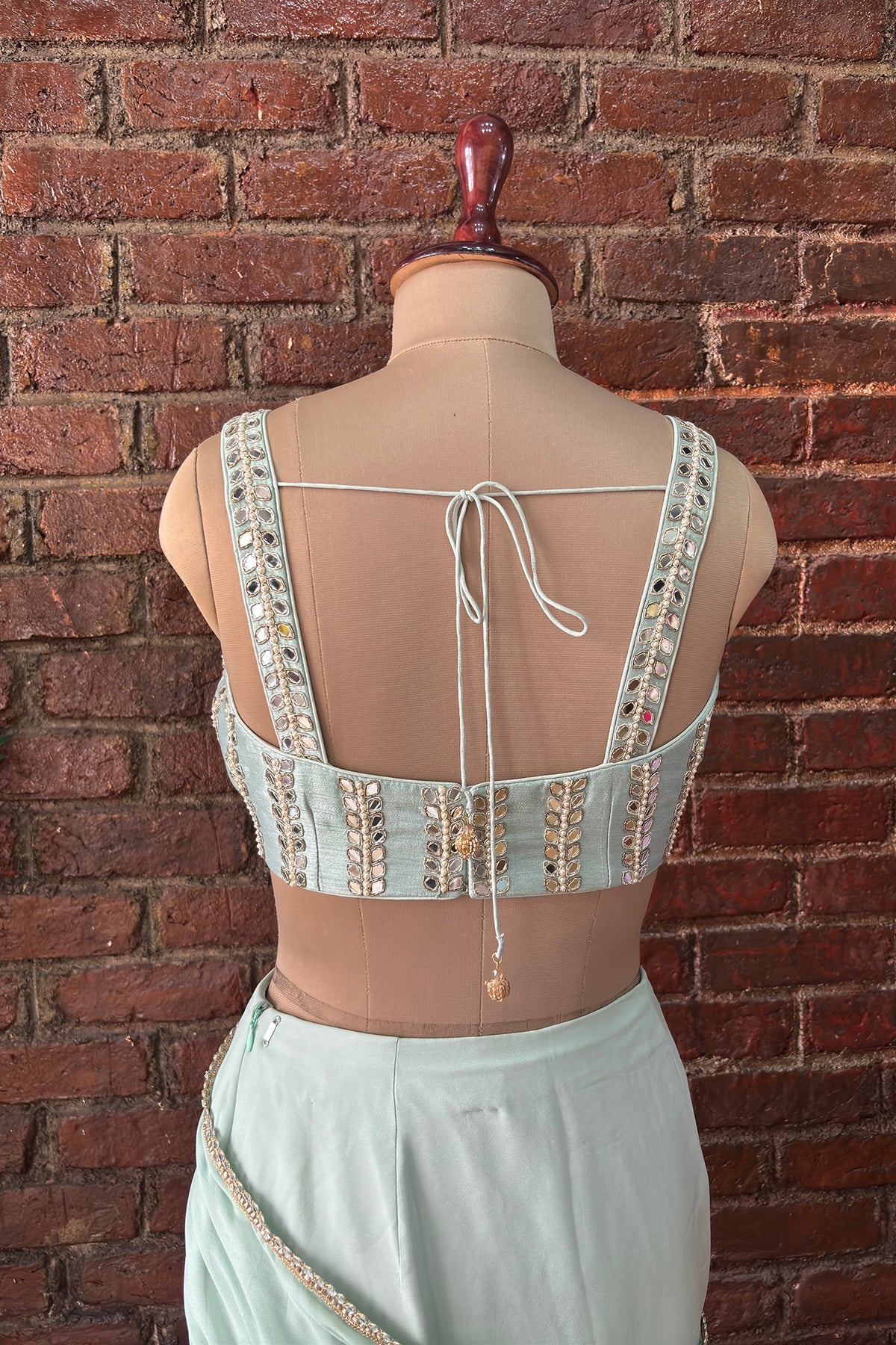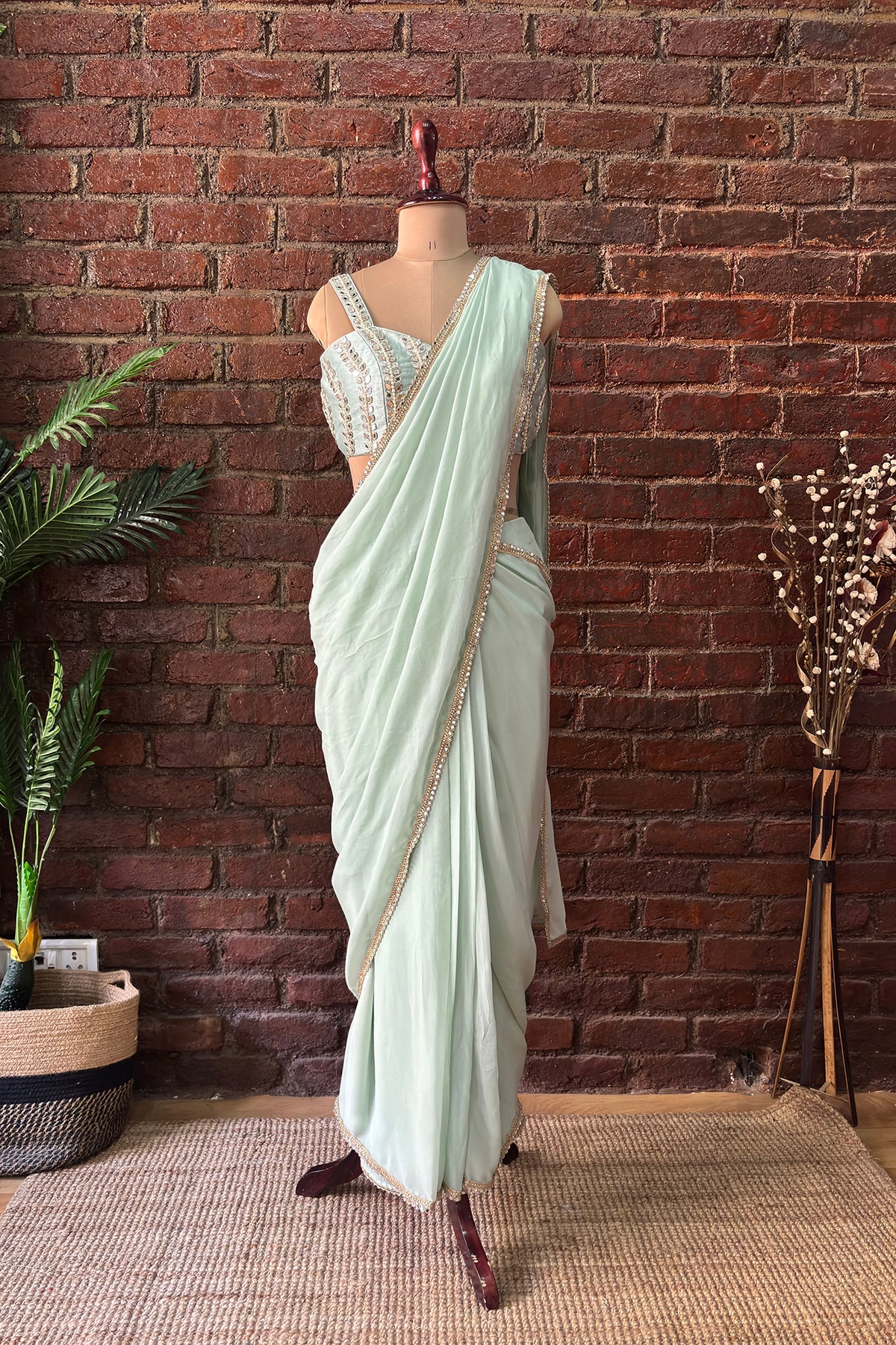 Mint Pre-draped georgette saree with delicate mirror work edging, paired with Same color raw silk bustier in contemporary Mirror and Pearl hand embroidery
