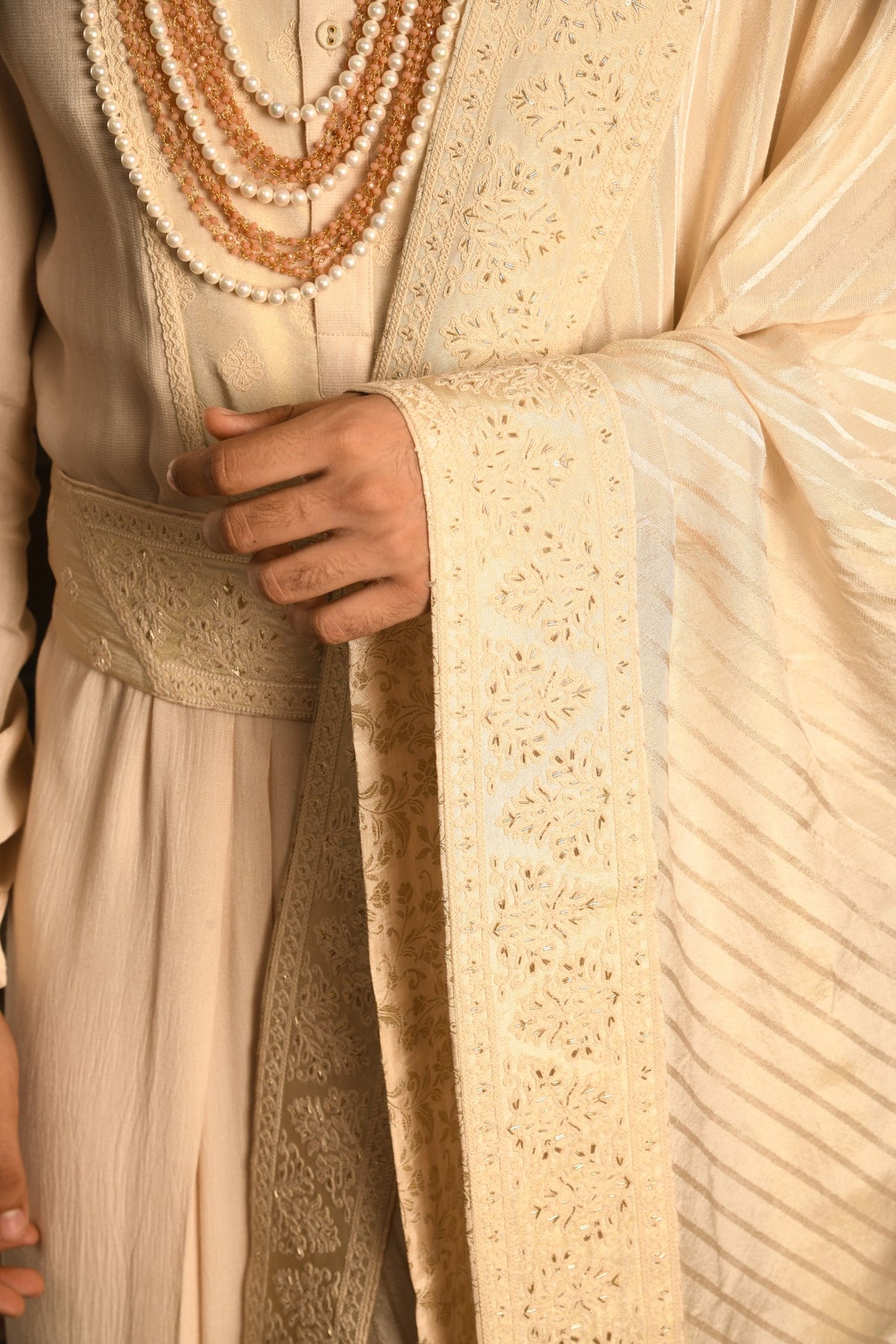 • Heirloom Embroidery: Both embroidery patterns on the sherwani are executed using the fine Dori embroidery technique, and are richly highlighted with delicate pearls and Zardozi work, ensuring a subtle yet captivating shimmer. The dupatta is framed with a rich four-sided Dori border, which is meticulously highlighted with Dori and Zardozi work, completing this truly imperial ensemble.