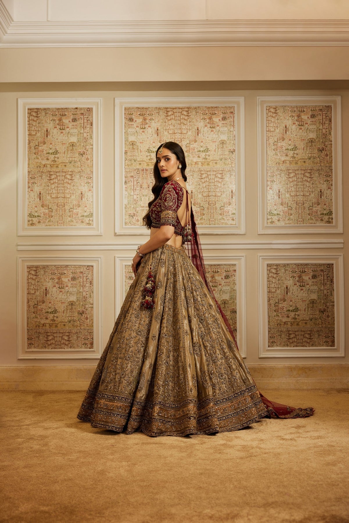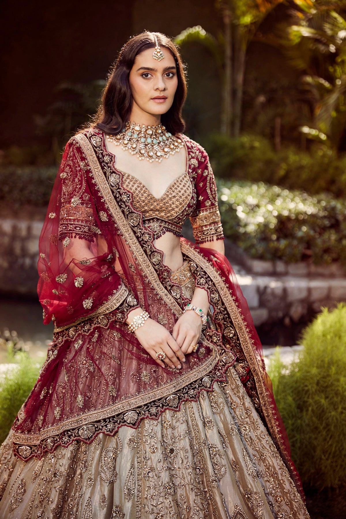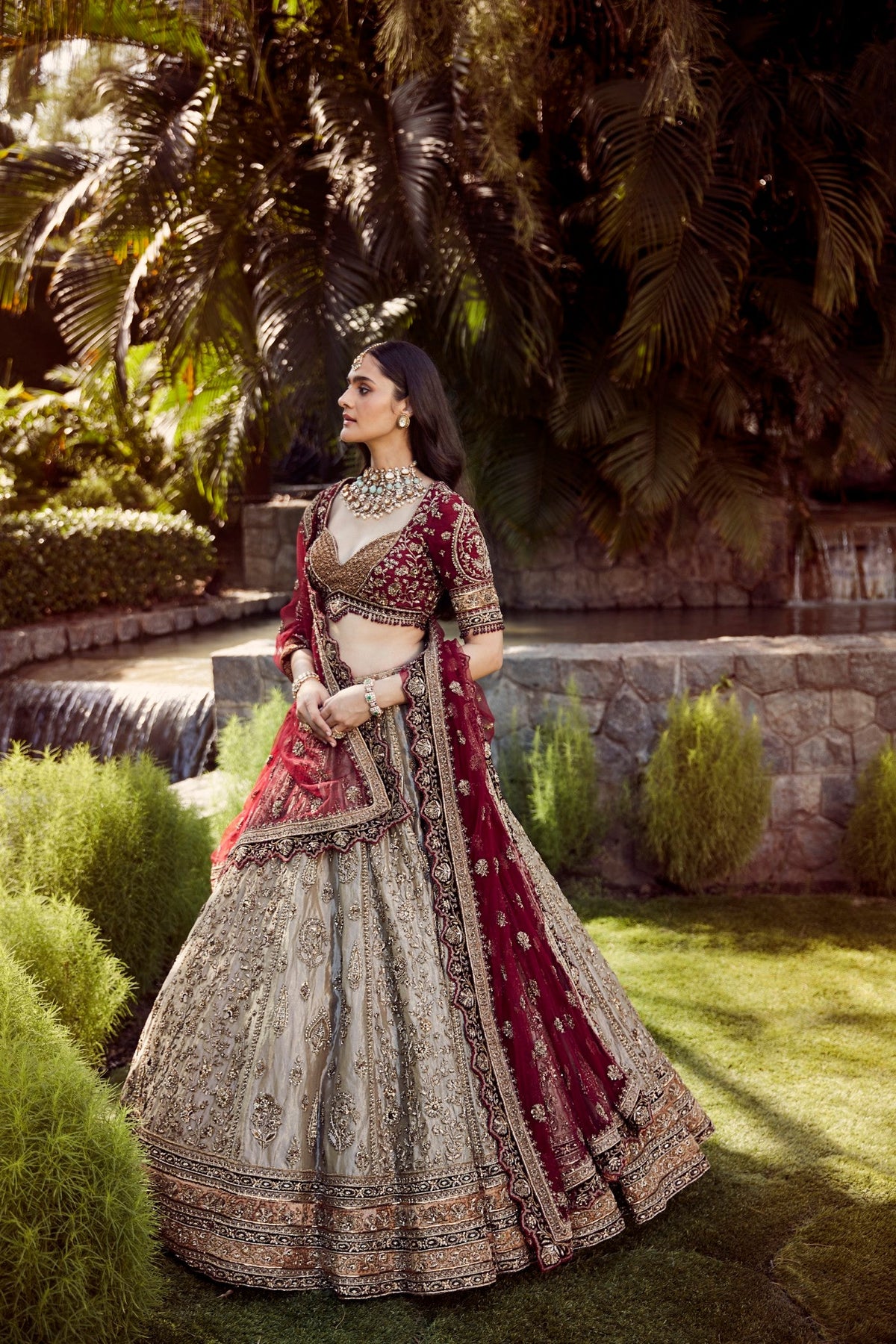 Showcasing Haneen- a masterpiece from ‘EVER AFTER’ - Bridal couture. This lehenga is a celebration of regal artistry and timeless tradition. The skirt is based on pure tissue, luminous and fluid, is intricately adorned with handcrafted zardozi embroidery enriched with velvet patching, lending depth and dimension to the design. The blouse is based on raw silk, with exquisite embroidery paired with effortless net scalloped dupatta. Rooted in the essence of new beginnings, each piece embodies the spirit of “ROQA” – a promise, a union, and the start of forever.