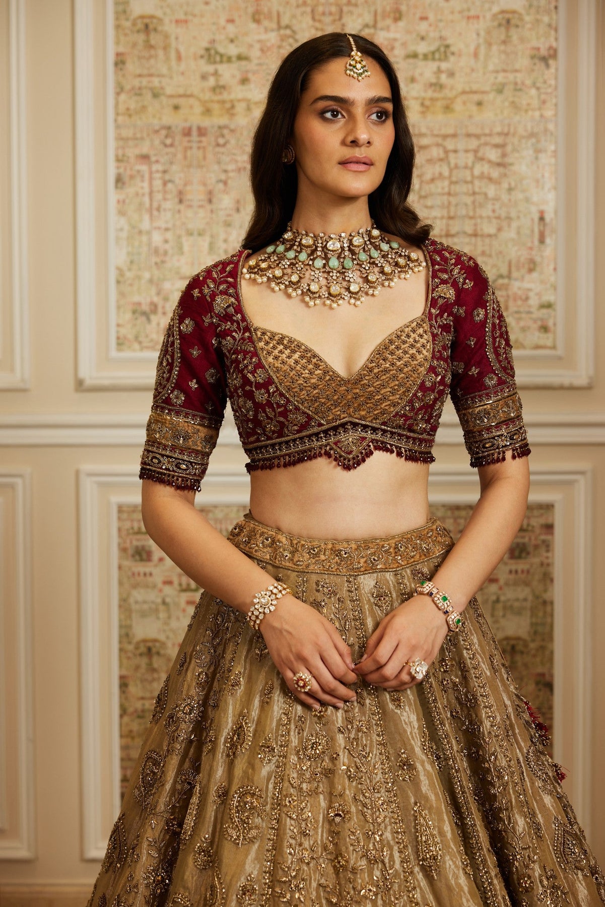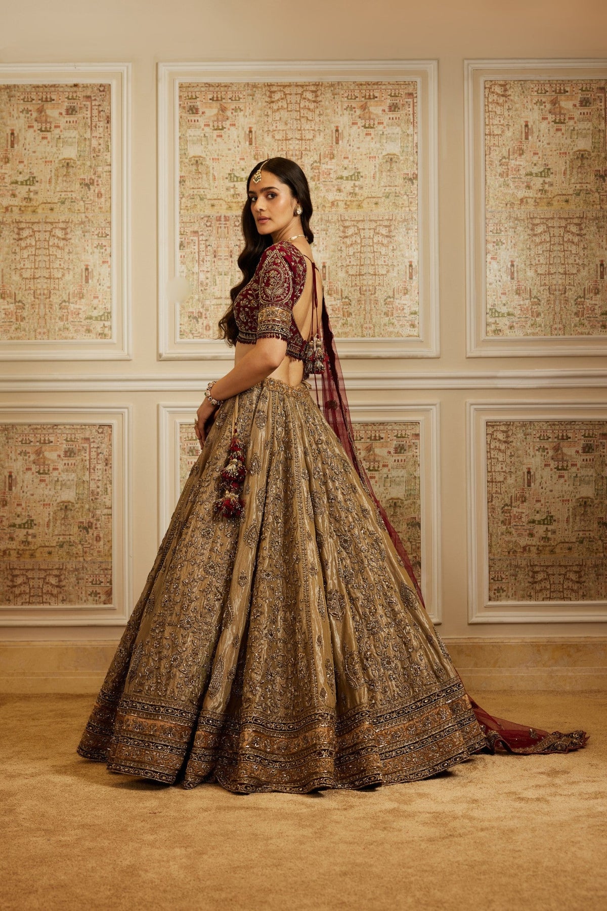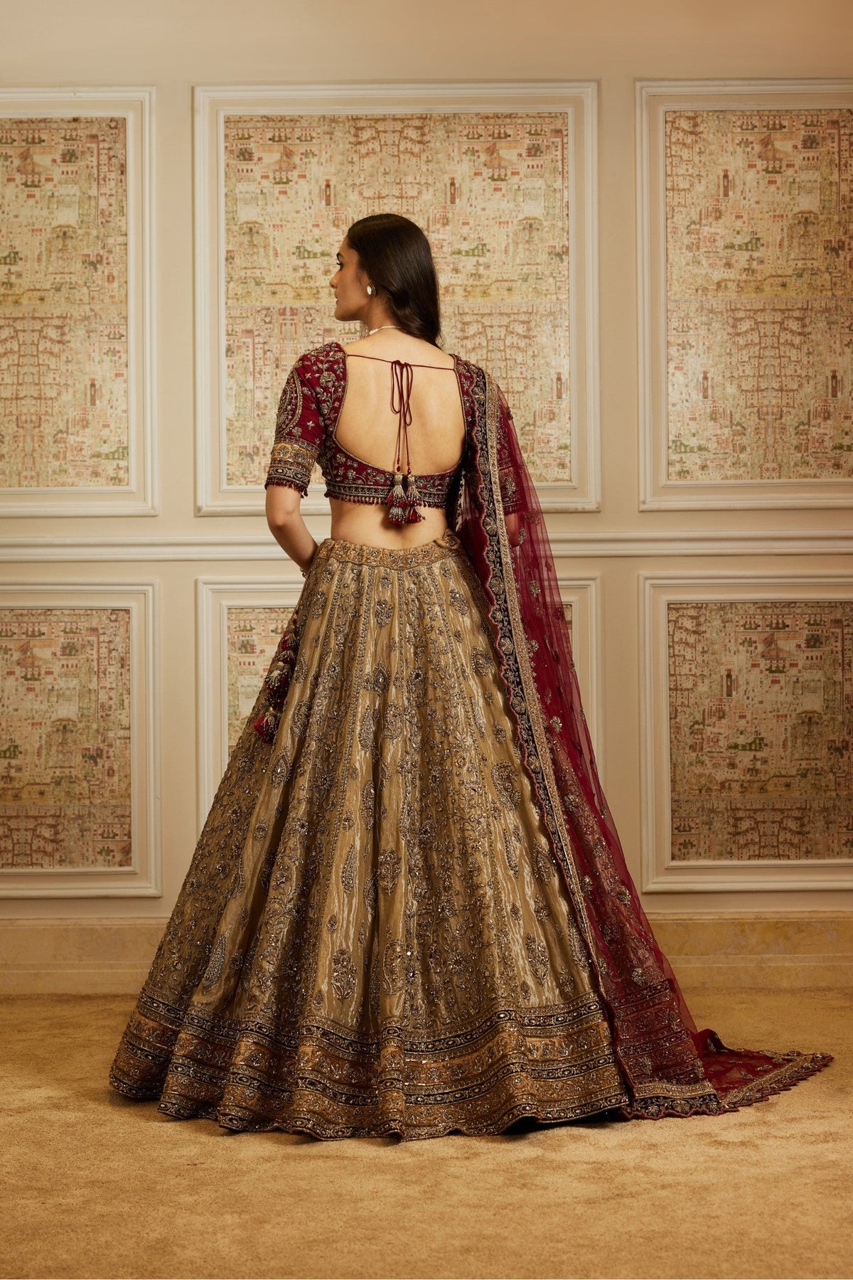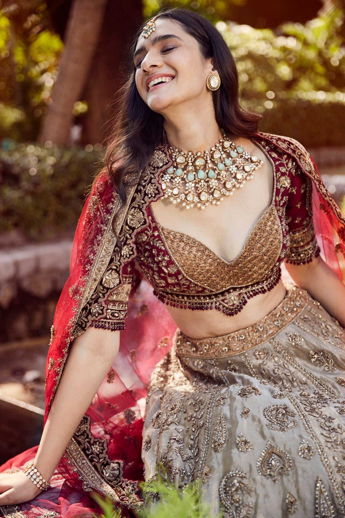 Showcasing Haneen- a masterpiece from ‘EVER AFTER’ - Bridal couture. This lehenga is a celebration of regal artistry and timeless tradition. The skirt is based on pure tissue, luminous and fluid, is intricately adorned with handcrafted zardozi embroidery enriched with velvet patching, lending depth and dimension to the design. The blouse is based on raw silk, with exquisite embroidery paired with effortless net scalloped dupatta. Rooted in the essence of new beginnings, each piece embodies the spirit of “ROQA” – a promise, a union, and the start of forever.
