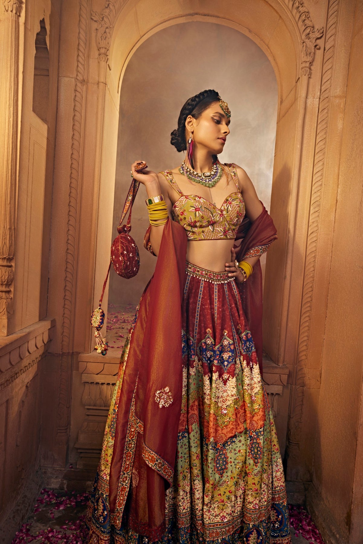 Revel in Traditional Indian Look In All Its Regal Splendor In Our Persian Carpet Inspired Lehenga Set With Intricate Hand Embroidery On The Skirt With Beads And Sequins. It Is Paired With A Meticulously Embroidered Blouse And Styled With A Co-Ordinated Dupatta.