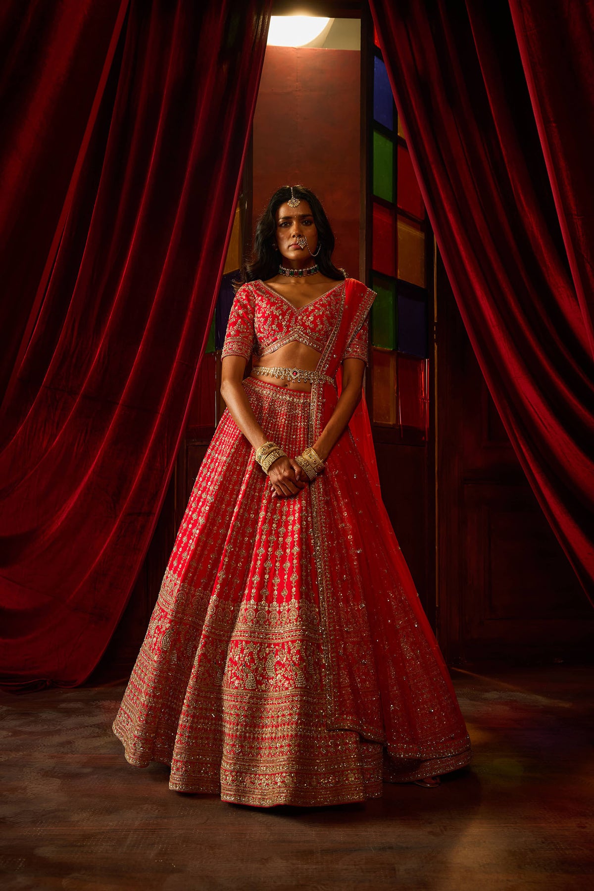 Kalighata features a mesmerizing Rani Pink Lehenga Set that captivates with its elegance. The eye-catching lehenga is crafted in raw silk with hand and machine embroidery. It is paired with a blouse and two dupattas. Accessorize it with statement earrings and heels for weddings or engagement ceremonies.