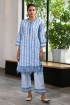 This blue cotton A-line kurta has vertical tonal embroidery all over with lace inserts. The neck and sleeves of the kurta is adorned with dainty lace and the kurta hem has big floral lace with organza inserts. Pair with cotton pants having tonal lace inserts on organza.