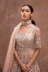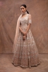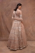 Featuring a gold jacket in net base with foil appliques and mirrors embroidery. It is paired with a matching lehenga, a bustier, and a dupatta.