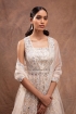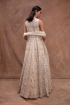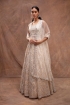 Featuring a white jacket in net base with foil appliques and mirrors embroidery. It is paired with a matching lehenga, a bustier, and a dupatta.