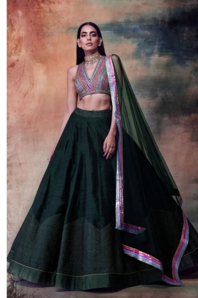 Badla Embroidery Multi Stripe Blouse with a raw silk quilted skirt and net dupatta set.