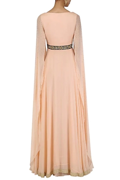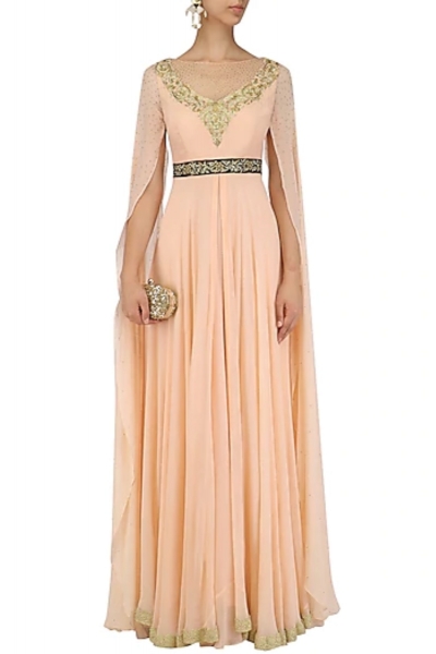 Featuring a peach gown in georgette with gold embroidered neckline and cape sleeves.